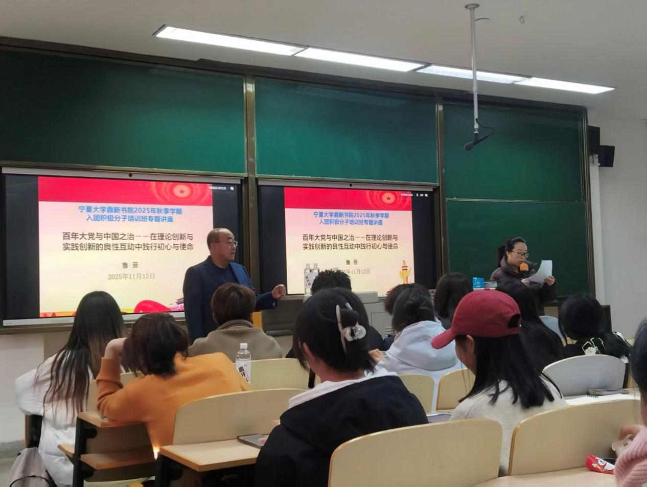 冬日暖阳,思想炽热。2025年11月12日,宁夏大学鼎新书院邀请校关工委宣讲团副团长鲁晋教授为鼎新书院2025年秋季学期入团积极分子培训班学员作“百年大党与中国之治:在理论创新与实践创新的良性互动中践行初心与使命”专题讲座,讲座由书院团委负责人王凤霞主持,180名入团积极分子参加。中国共产党穿越风雨,始终永葆生机,而新时代的青年也在此次学习中,进一步坚定了追随旗帜、担当使命的理想信念。
