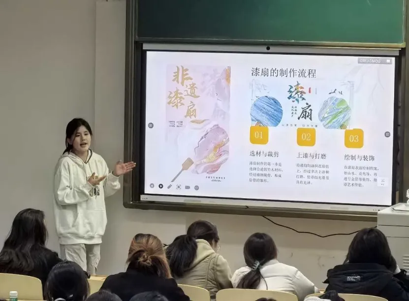 为激活非遗文化生命力,拓宽学生艺术视野,丰富校园文化实践活动,2025年11月7日,鼎新书院学生会宣传与对外联络部在文萃一教122精心打造了一场以“艺彩生花,筑梦青春”为主题的漆扇艺术创作与文化体验活动。
