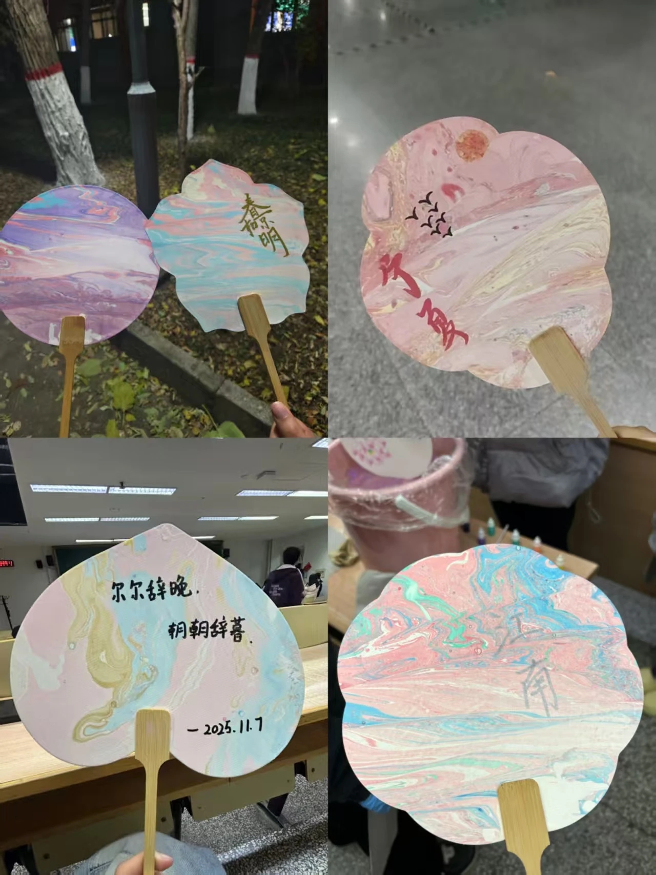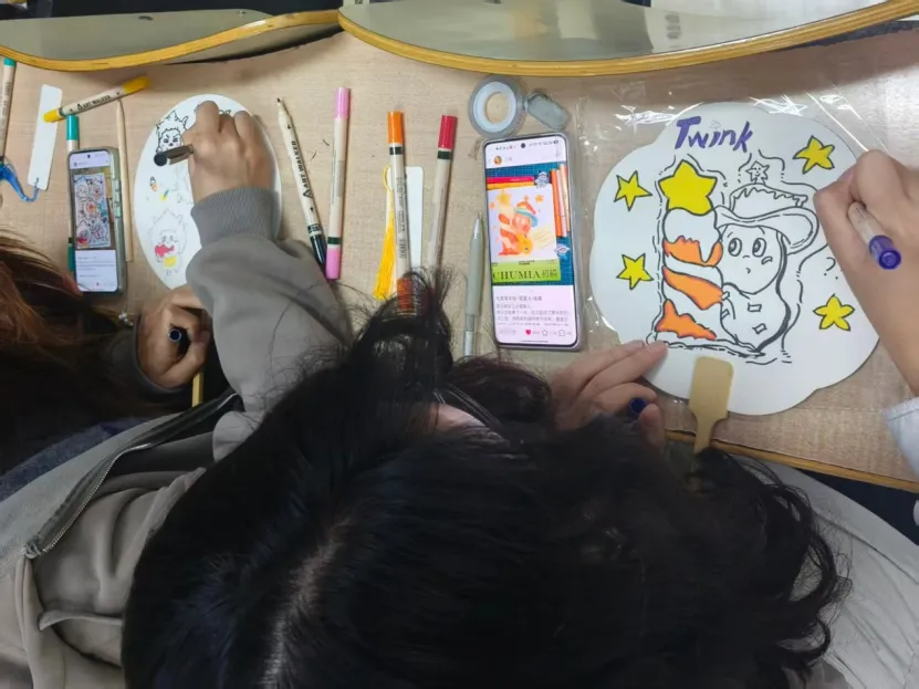 随后,同学们开始精心挑选颜料,滴漆入水,他们手持素面扇与书签,扇面随着水面色彩的交融,晕染出斑斓色彩,构成一幅幅美丽画面。同学们将非遗元素与个人创意结合,灵活运用传统漆艺技法,展开了一场别开生面的创作盛宴。以细腻笔触勾勒纹样,还原中华美学意境,让扇面兼具文化底蕴与个性活力。随着创作推进,一柄柄兼具非遗韵味与时代活力的漆扇逐步成型。