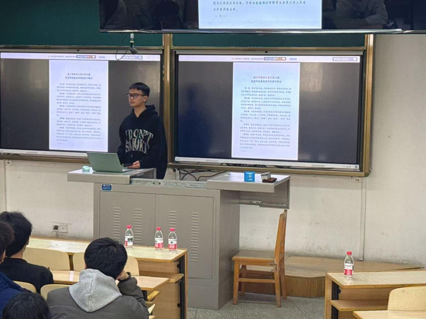 培训分为四部分。第一部分由蒋壹良领学了全国学联印发的《关于学联学生会工作人员改进作风服务同学的若干规定》通知,强调要求学生会工作人员要恪守学生本分,牢记服务宗旨,永葆理想情怀,勤勉务实做事,营造平等氛围。同时还介绍了《共青团指导学生联合会工作的若干规定(试行)》的通知,让学生骨干们明确了学生联合会应在团委的正确指导下,确保学联以习近平新时代中国特色社会主义思想为指导,加强同学们全心全意服务同学的意识。此外,关于《巩固高校学生会(研究生会)改革成果的若干措施》文件精神,让学生骨干们了解到要持续深化学生会改革,抓严骨干管理,防止脱离同学、官僚气、庸俗化等问题。