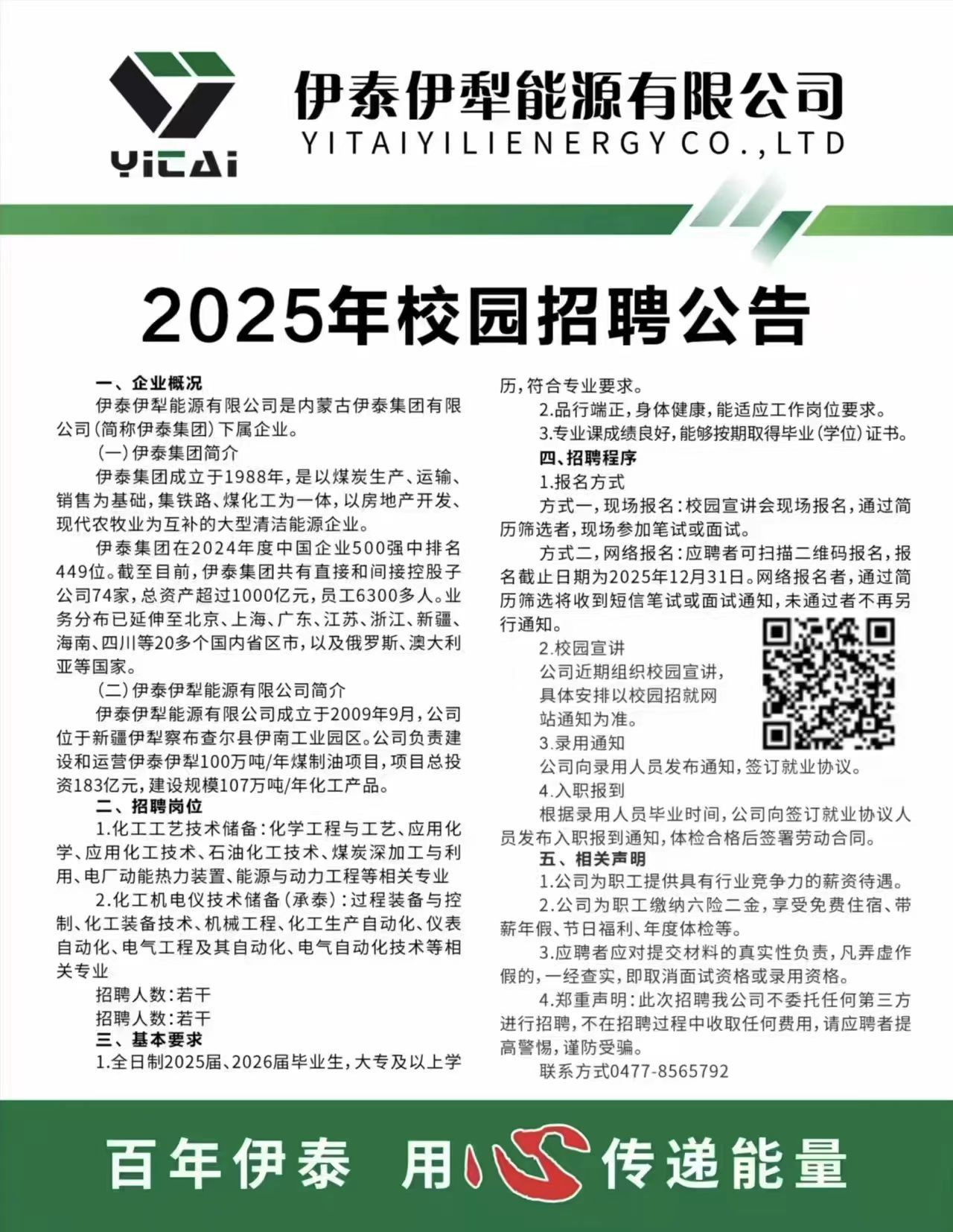 伊泰伊犁能源有限公司2025年校园招聘公告